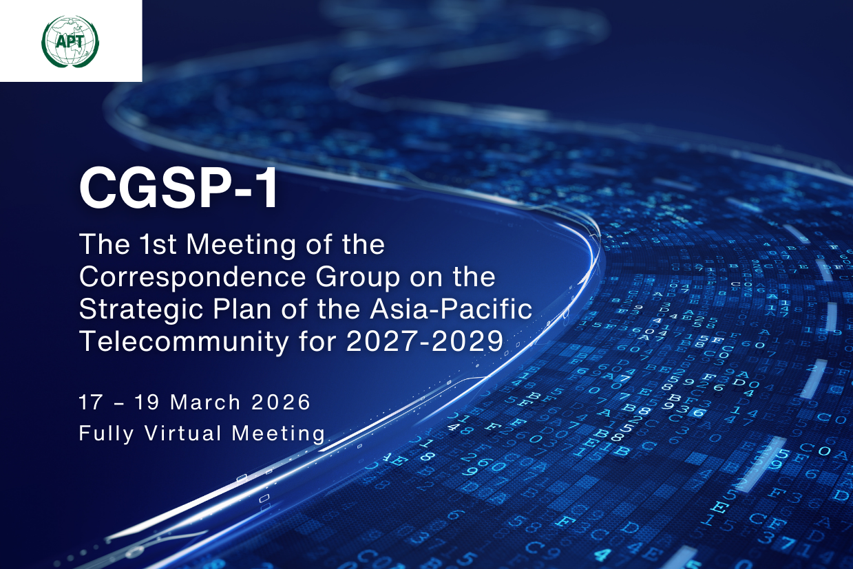 The Asia-Pacific Telecommunity (APT) will organize a fully virtual meeting of the 1st Meeting of the Correspondence Group for the Strategic Plan of the APT for 2027-2029 (CGSP-1) from 17-19 March 2026.